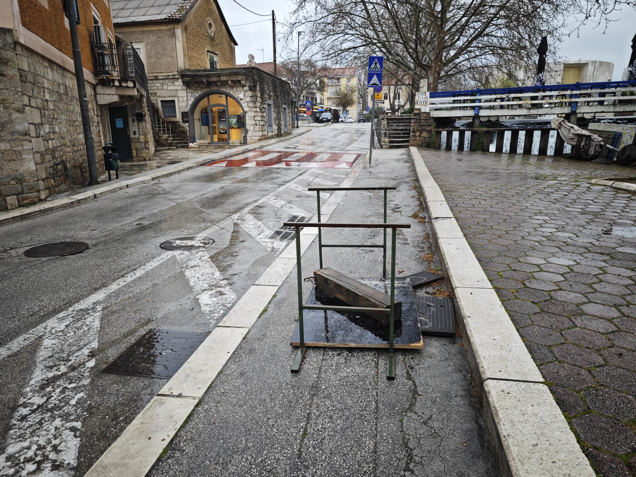 Nakon što je prvotno puknuta šahta bila “sanirana” stolom iz kafića, gradske službe su odlučile uložiti dodatni trud – sada imamo prometni stupić kao zamjenu za “remek-djelo”. Možda je ovo korak naprijed u sigurnosnim mjerama, ali vizualno i dalje ostavlja dojam instalacije pod nazivom “Kaos na asfaltu”.