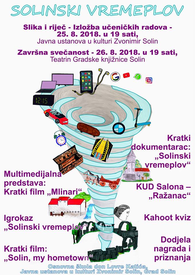 Projekt „Solinski vremeplov” uključuje cjeloviti inovativni pristup kulturnoj baštini usmjeren njezinom očuvanju i promidžbi kroz niz povezanih događaja i aktivnosti koje u partnerstvu provode Osnovna škola don Lovre Katića i Javna ustanova u kulturi Zvonimir pod pokroviteljstvom grada Solina.