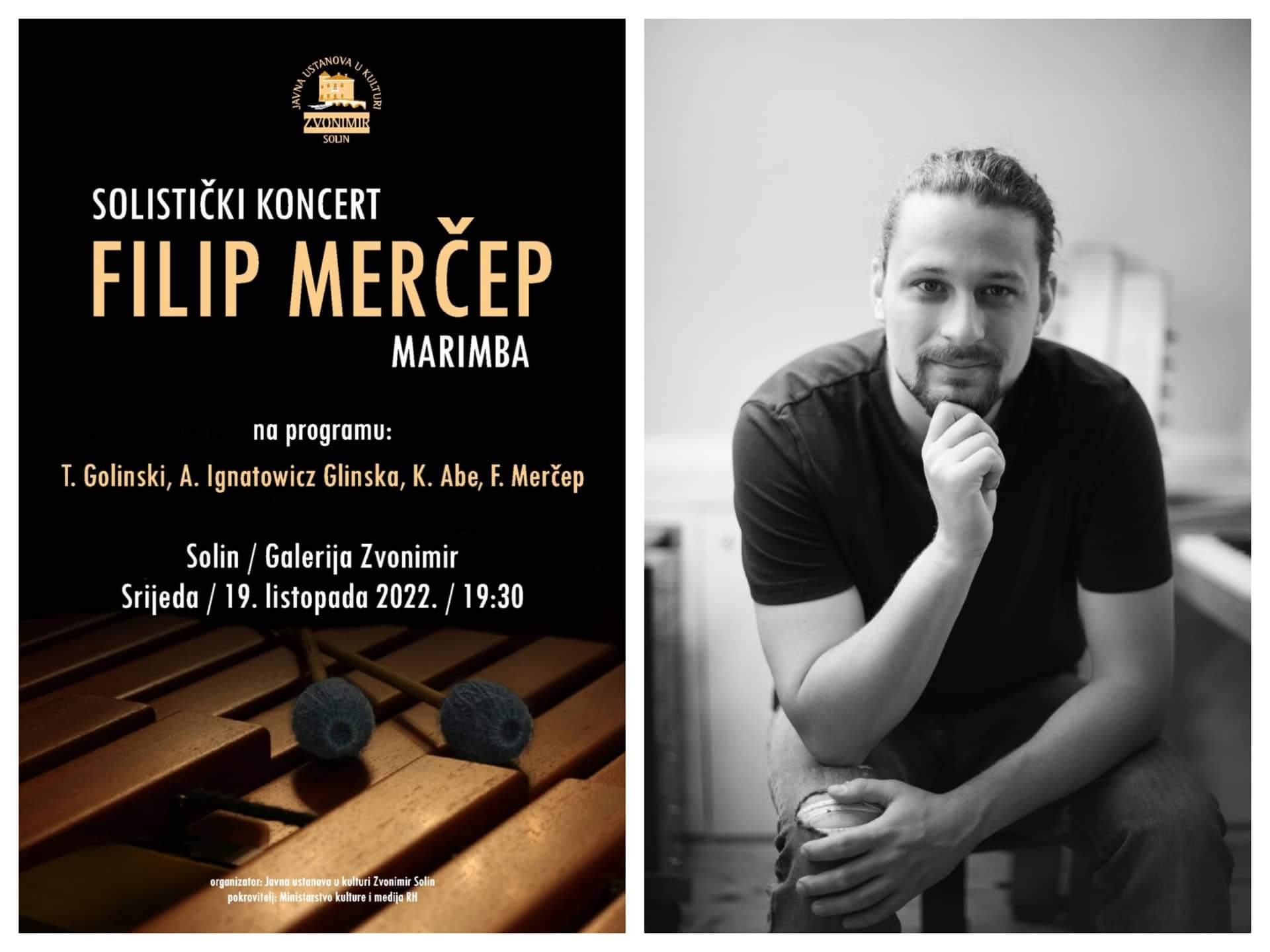 Javna ustanova u kulturi Zvonimir Solin u sklopu koncertne sezone 2022/23 priređuje solistički koncert FILIPA MERČEPA, poznatog hrvatskog udaraljkaša mlađe generacije, koji će nastupiti na marimbi. Na programu su djela T. Golinskog, A. Ignatowitz Glinske, K. Abea i F. Merčepa. Koncert će se održati u Galeriji Zvonimir, u srijedu, 19. listopada 2022. godine s početkom u 19:30 sati. Ulaz je slobodan.