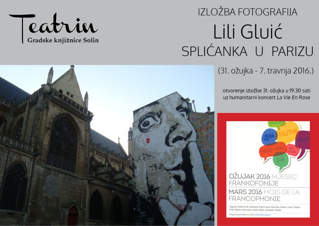 Povodom Mjeseca frankofonije u Teatrinu GKS od 31. ožujka do 7. travnja održat će se izložba fotografija Lili Gluić SPLIĆANKA U PARIZU. Otvorenje izložbe održat će se 31. ožujka (četvrtak) u 19.30 h uz humanitarni koncert Prijatelja šansone “La Vie en Rose”.