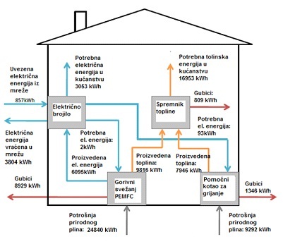 Takav uređaj zadovoljava potrebe kućanstva za električnom energijom od 3053 kWh i toplinskom energijom od 16 953 kWh, a za to potroši 34132 kWh prirodnog plina, ali pri tome proizvede i isporuči u mrežu (neto) višak od 2947 kWh električne energije. Ekvivalentni standardni uređaj s klasičnim plinskim kotlom i spremnikom PTV bi utrošio 20771 kWh prirodnog plina za zadovoljenje iste potrebe za toplinskom energijom, dok bi se 3053 kWh trebalo kupiti iz električne mreže. Iz navedenog se može zaključiti da bi kogeneracijski uređaj trošio 10% manje primarne energije, u ovom slučaju prirodnog plina, uz efikasnost pretvorbe prirodnog plina u električnu energiju od 38% (prema podacima godišnjeg energetskog pregleda za Hrvatsku u 2012.). Zanimljivo je primijetiti da uz prosječnu prodajnu cijenu prirodnog plina od 0,3952 kn/kWh (3,66 kn/m3) i prosječnu prodajnu cijenu el. energije od 0,83 kn/kWh (prema podacima Eurostat-a za Hrvatsku u 2012.), takav uređaj u Hrvatskoj ne bi bio ekonomičan. Kogeneracijski uređaj bi trošio 13 488 kn za prirodni plin, dok vraćanjem el. energije u mrežu ostvaruje uštedu od 2 446 kn, što čini ukupni godišnji trošak kogeneracije od 11 042 kn. Za rad klasičnog sustava potrebno je potrošiti 2 706 kn za kupnju el. energije, te 8 209 kn za prirodni plin, dakle ukupno 10 915 kn. Razlog ove neekonomičnosti leži u netržišno reguliranim cijenama električne energije i prirodnog plina u Hrvatskoj ( s omjerom cijena el. energije/ cijena plina od svega 2,1 ), ali i u relativno niskoj električnoj i ukupnoj efikasnosti analiziranog kogeneracijskog uređaja s gorivnim člancima od svega 24,5% odnosno 64%. Prema podacima proizvođača ovakvi uređaji mogu postići efikasnost višu od 30%, odnosno ukupnu i do 90%. U tom slučaju bi kogeneracijski uređaji i u Hrvatskoj mogli ostvarivati godišnje uštede od 1 985 kn (18%), odnosno 8 343 kWh primarne energije (28%).
