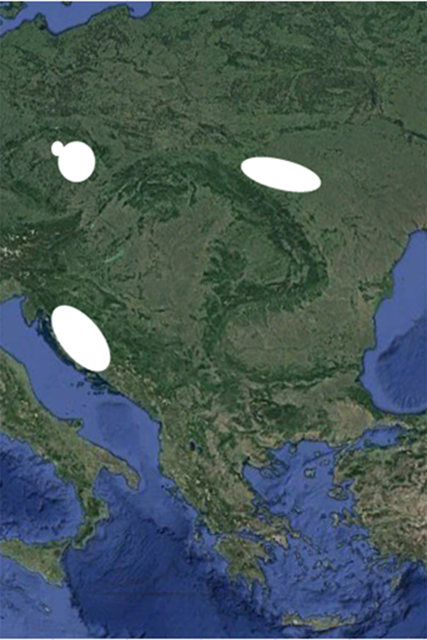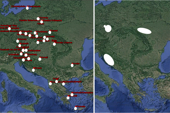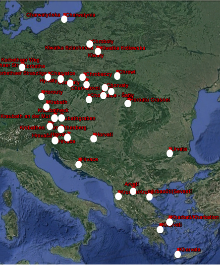 Lokacije nekih mjesnih toponima s osnovom „hrvat“ od krajnjeg jugoistoka Europe pa sve do krajnjeg sjevera Srednje Europe te istočno od crte istočna Njemačka – istočne Alpe