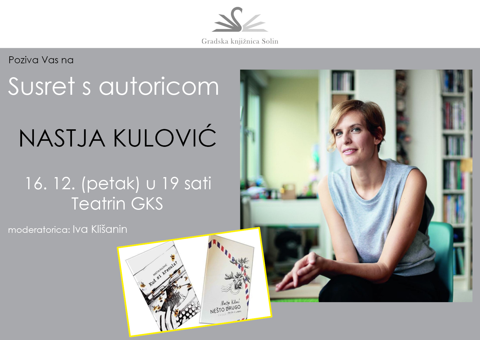 Ciklus Susreta s hrvatskim autorima u 2022.g. Gradska knjižnica Solin zaokružit će gostovanjem Nastje Kulović. Susret će se održati u petak, 16. prosinca u 19 sati u Teatrinu Gradske knjižnice Solin. Večer će moderirati Iva Klišanin koja će s autoricom razgovarati o njenim knjigama “Kud si krenula?” i “Nešto drugo”, ali i o njenom životu i borbi s dijagnozom multiple skleroze te o odlukama koje su joj promijenile život nakon dijagnoze.