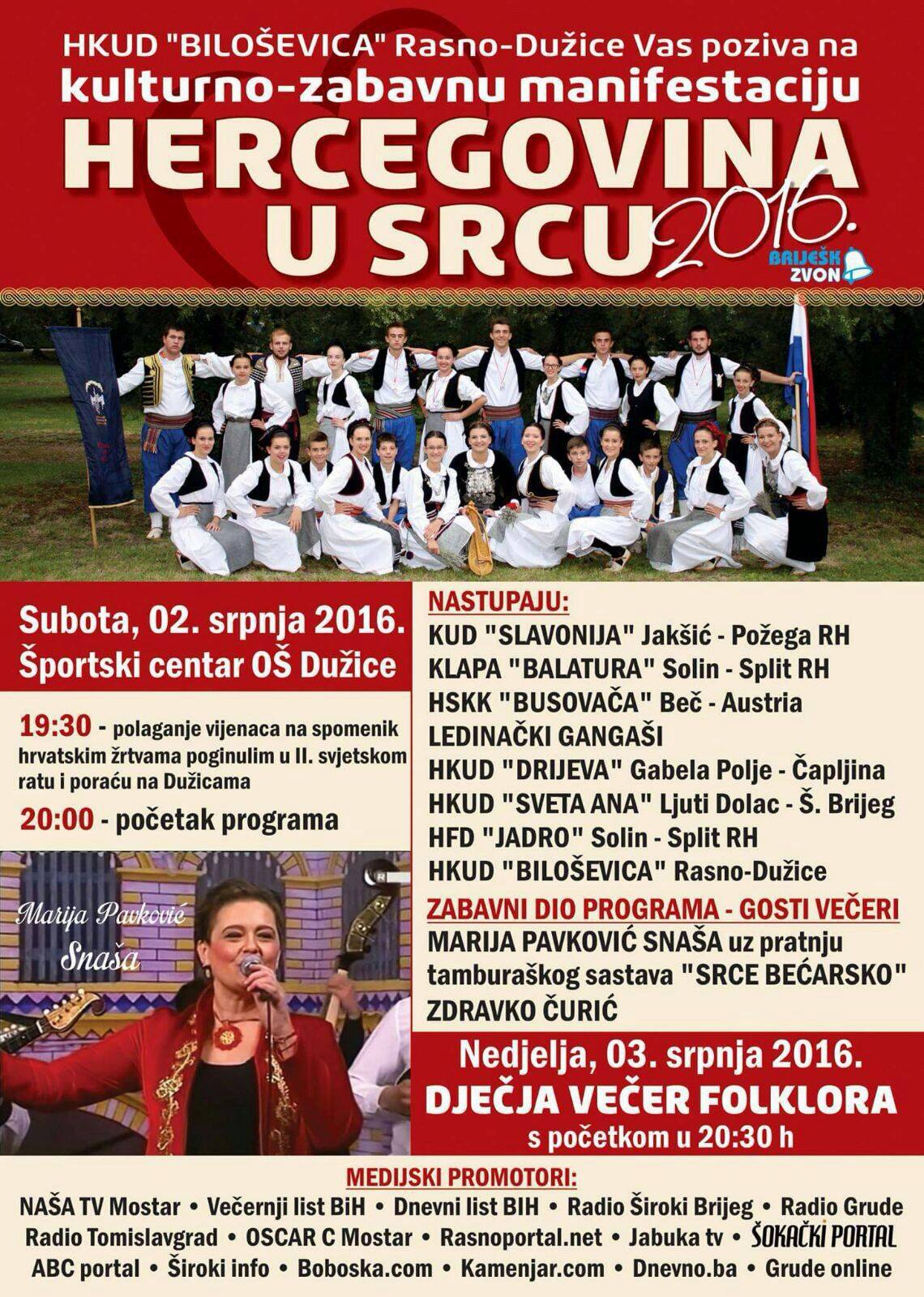 “Hercegovina u srcu” je jedna od značajnijih kulturnih događanja u gradu “Široki Brijeg” i sastavni je dio kulturnog događaja “BRIJEŠKA ZVONA” 2016. HKUD Biloševica je mlado društvo po stažu i članstvu a u kratkom vremenu kulturnog rada postaje jedno od najboljih kulturno-umjetničkih društava na ovim prostorima u regiji Hercegovine po aktivnostima, uspjesima i naravno kao organiziran KUD u svakom pogledu .