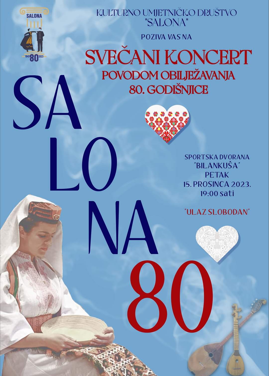 U petak, 15. prosinca 2023.g. u dvorani na Bilankuši s početkom u 19:00 sati, održat će se svečani koncert povodom obilježavanja 80. godišnjice KUD-a Salona.