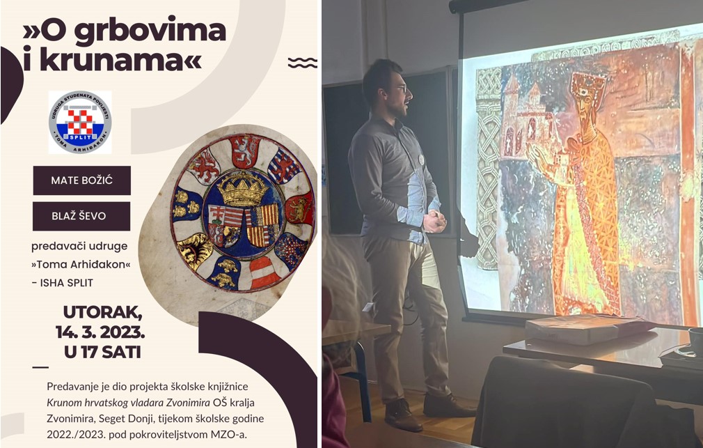 Najava održavanja edukativnog programa „O grbovima i krunama“ Udruge „Toma Arhiđakon“ 14. ožujka 2023. u osnovnoj školi „Kralja Zvonimira“ – Seget Donji; Blaž Ševo – član Udruge „Toma Arhiđakon“ i voditelj radionice „Kruna kralja Zvonimira“ prigodom održavanja edukativnog programa