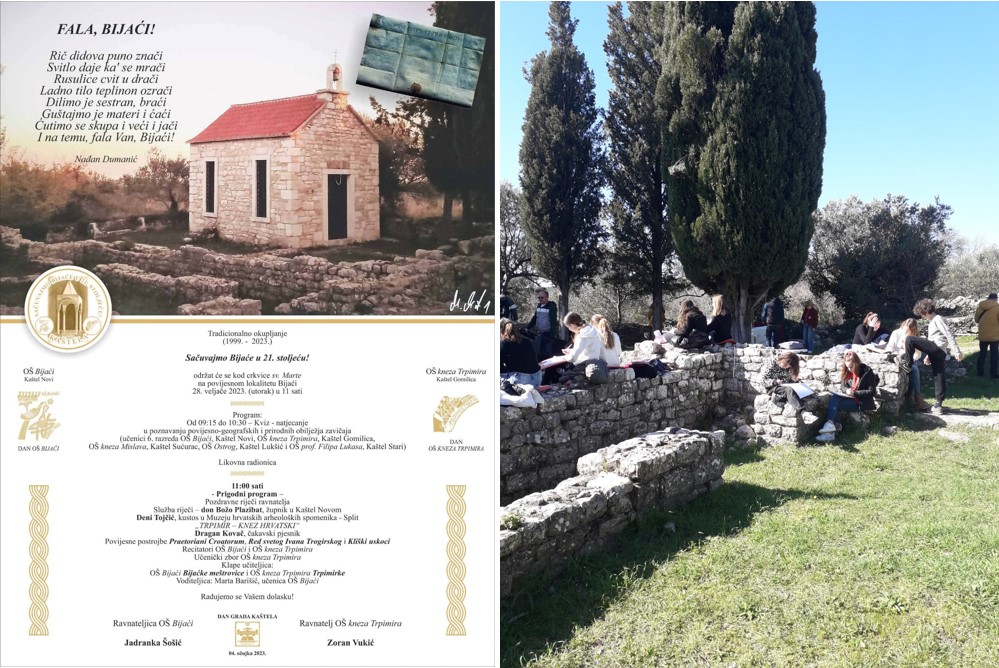 Najava manifestacije „Sačuvajmo Bijaće u 21. stoljeću!“ 2023. godine (održavanje koje je isprva planirano 28. veljače, ali je bilo odgođeno za 17. ožujka ove godine); učenice i učenici prilikom održavanja likovne radionice u okviru navedenog događaja održanog povodom 1171. godišnjice izdavanja Trpimirove darovnice