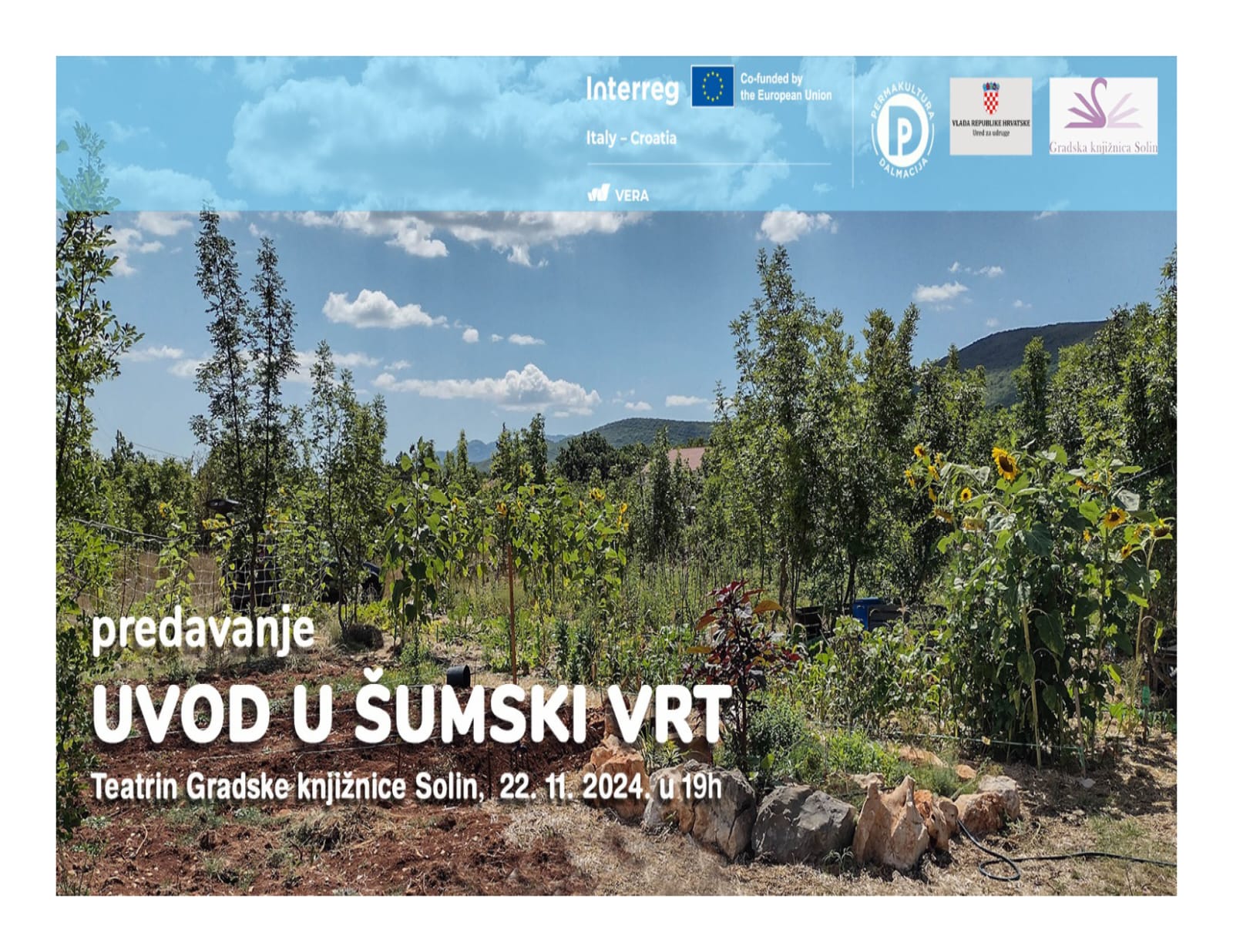 Predavanje organizira Udruga Permakultura Dalmacija, a dio je projekta VERA – “Sustainable agricultural models for biodiversity preservation” financiranog u sklopu Interreg programa prekogranične suradnje Italija-Hrvatska (Prioritet programa 2 – Green and resilient shared environment) te je sufinanciran sredstvima Ureda za udruge Vlade RH.