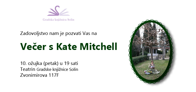 Gradska knjižnica Solin poziva na Večer s Kate Mitchell koja će se održati u Teatrinu u petak, 10. ožujka s početkom u 19 sati. Gošće večeri su E.S.K. i Lenka Gospodnetić.