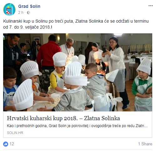 Oprostite na izrazu, ali ovo nije neistina već čista laž. Riječ je o Hrvatskom kuharskom kupu 2018. – “Zlatna Solinka” čije je pokrovitelj Grad Solin. Natjecanje koje organizira Udruga kuhara Splitsko-dalmatinske županije.