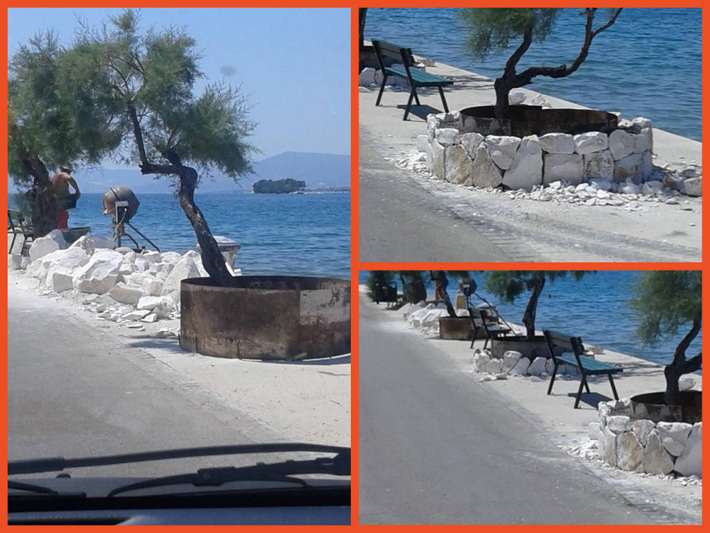 Pogledaj ovi zid uz cestu jedne od najprometnijih ulica u Solinu,  fra Grge Martića, koja se spaja na glavnu Ulicu Kneza Trpimira, stotine auta prođe dnevno. A vidi kako u Vranjicu oblažu stabla u kamen, pa ni za vrime cara Dioklecijana to nisu radili.