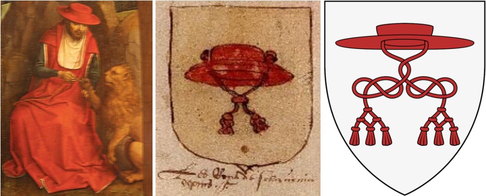 Prikaz sv. Jeronima – s prepoznatljivim kardinalskim šeširom – kako vadi trn iz noge ranjenog lava. Vrlo sličan oblik turnirskog šešira nalazimo u heraldičkom znamenju tzv. Slovinske marke (Windische Mark, jugoistočni dio današnje Slovenije), kao npr. u zbirci grbova Universeel wapenboek (oko 1558.), dok je u Sutješkom rodoslovlju (oko 1585.) taj grb pripisan „Kraljevini Slovinskoj“ (rekonstrukcija)