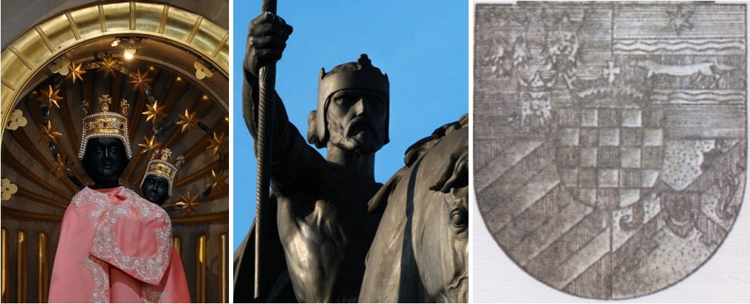 Okrunjeni vladar sa starohrvatskom krunom na reljefu u krstionici Sv. Ivana; istovjetna kruna iznad hrvatskog nacionalnog grba na naslovnici djela „Stopama hrvatskih narodnih vladara“ F. Bulića i L. Katića iz 1932. godine