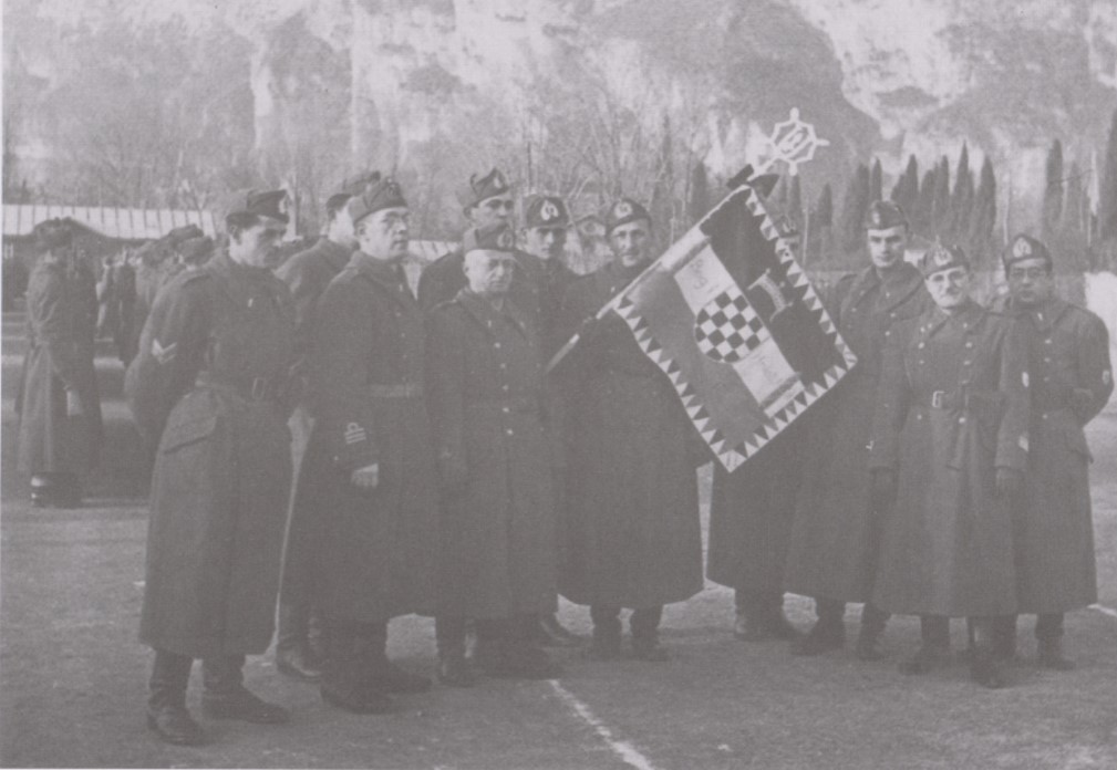 Zastava Lako prevoznog zdruga Hrvatske legije prilikom svečanosti primopredaje ratnog stijega, Riva del Garda, 16. veljače 1942. godine