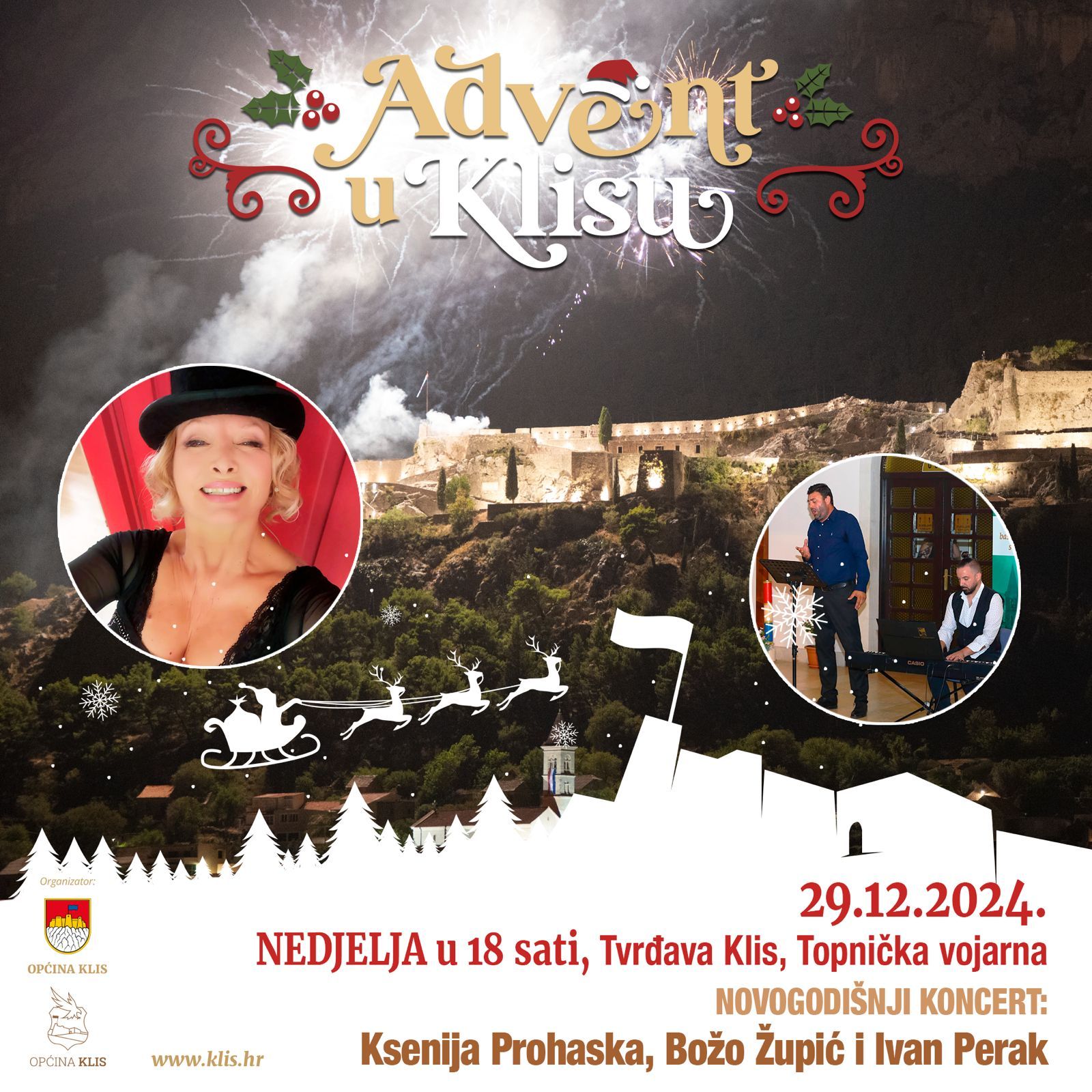 Nedjelja, 29.12. – Novogodišnji koncert: Ksenija Prohaska, Ivan Perak i Božo Župić Zadnji dan Adventa donosi glazbenu poslasticu za odrasle! U autentičnom prostoru Topničke vojarne Tvrđave Klis, s početkom u 19:00 sati, nastupit će: